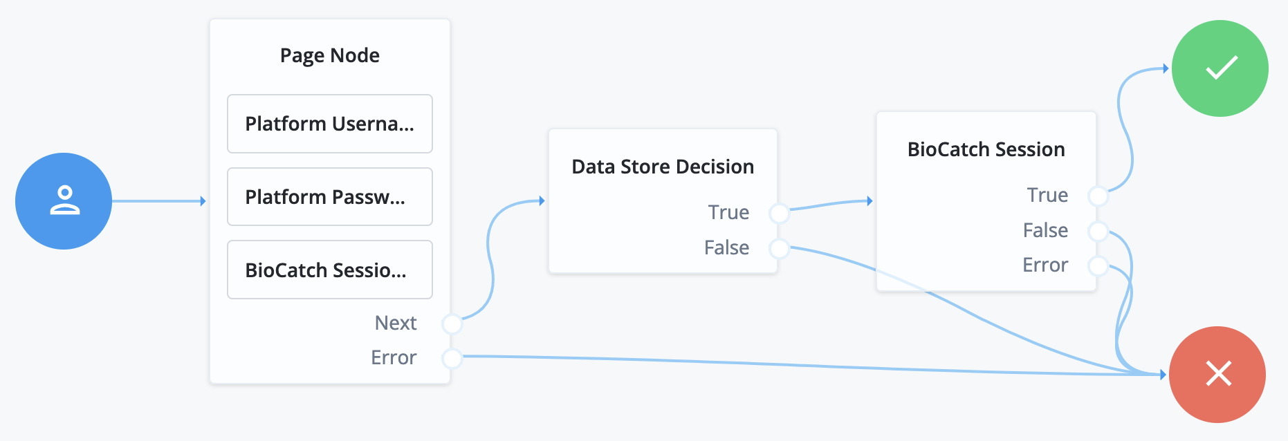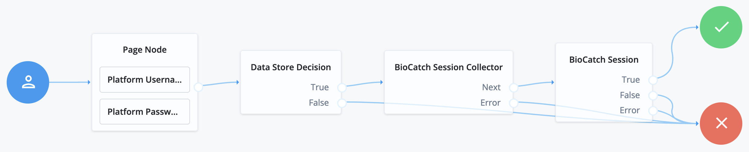It collects the identifier with the BioCatch Session Collector node and initiates scoring: