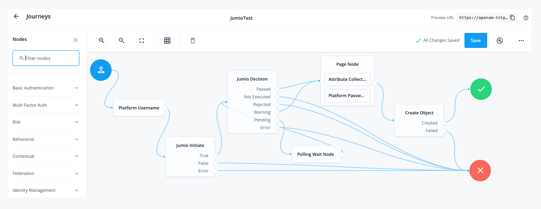 The following example journey uses Jumio Initiate and Jumio Decision nodes to authenticate a user and create an identity:
