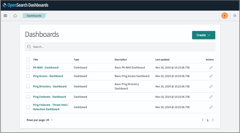 Dashboards provides you with pre-built dashboard templates for PingOne Advanced Services, which allow you to visualize your data. Learn more about Using the Dashboards application in the OpenSearch documentation.