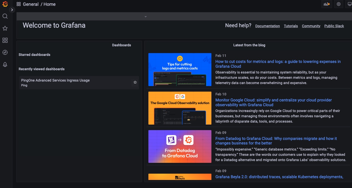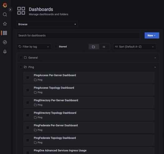 You can also use Grafana to monitor your applications using interactive dashboards with charts and graphs. Information is pulled from the PingFederate, PingAccess, and PingDirectory, application endpoints, and displayed in the dashboards. Learn more about these dashboards in Using Grafana to monitor your applications.