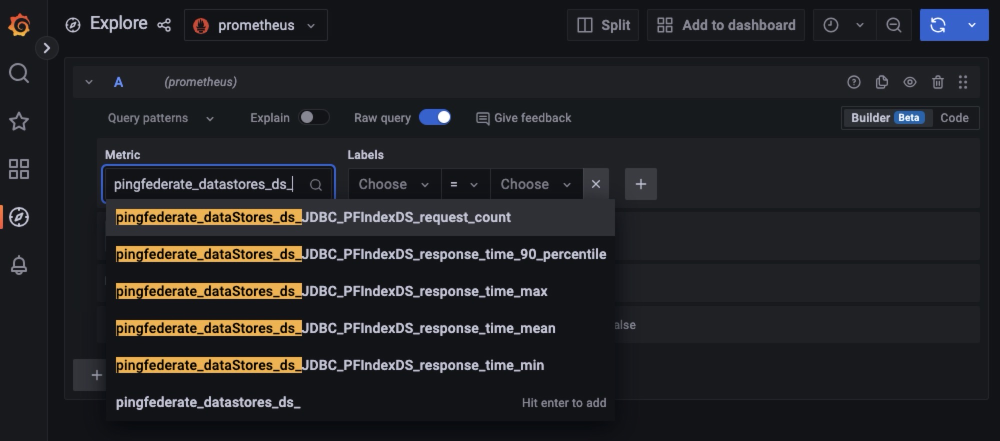 To look for external services that are impacting PingFederate performance, enter PingFederate_dataStores*,PingFederate_connections*, orPingFederate_adapters*in the Metrics field.