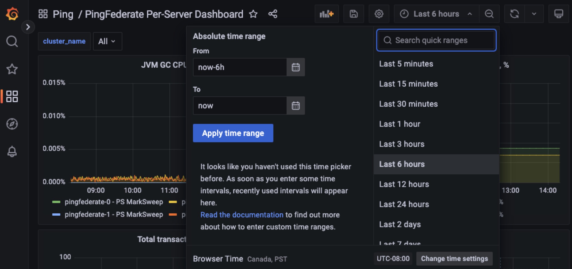 The last six hours are displayed by default. Ensure that Grafana is set to your time zone.