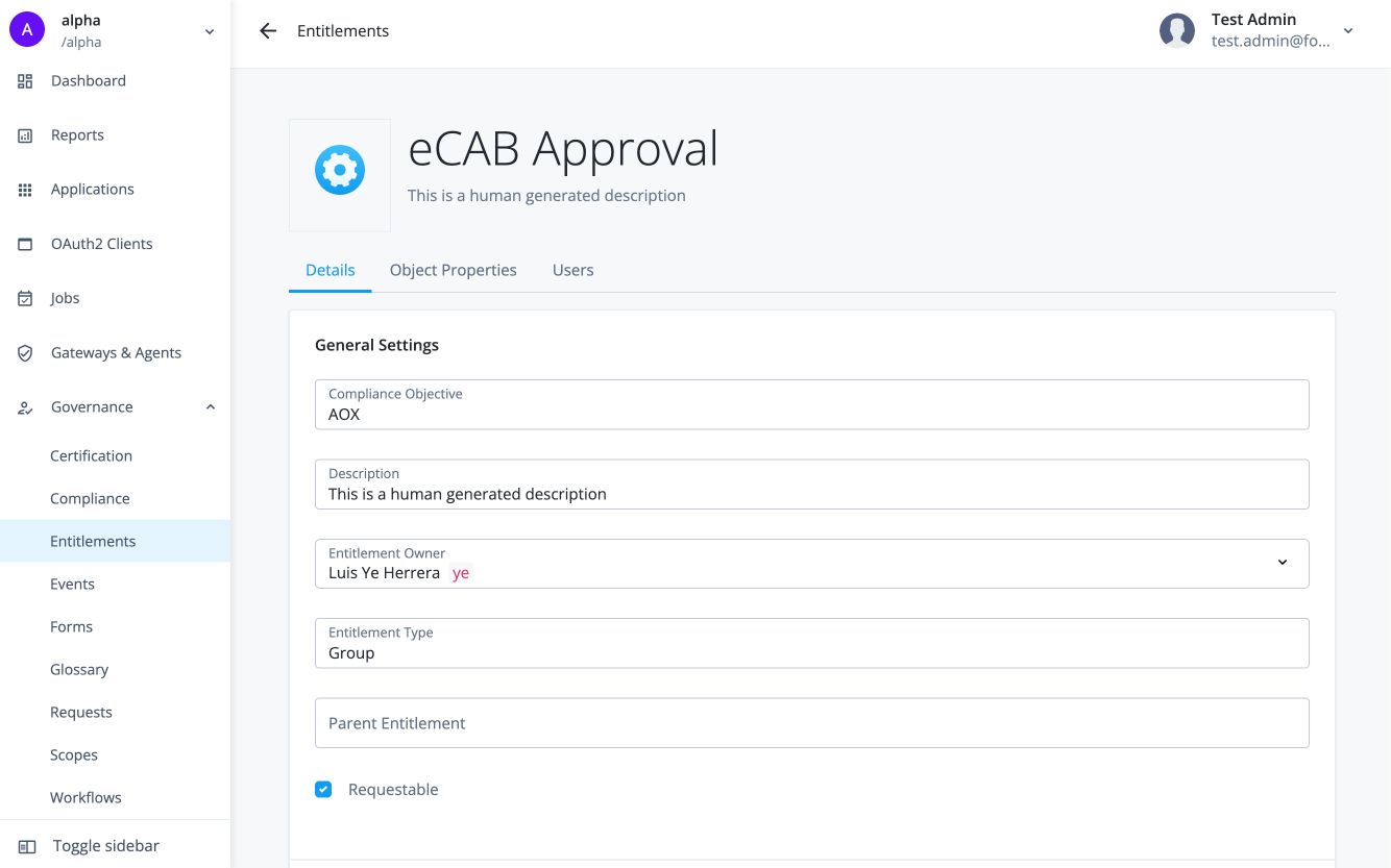Administrators can enhance entitlements by adding meaningful business context, helping users understand their purpose and supporting Identity Governance in decision-making. This context is managed through the Entitlement Glossary, where administrators can add custom attributes in addition to the default ones.